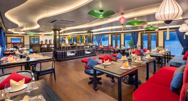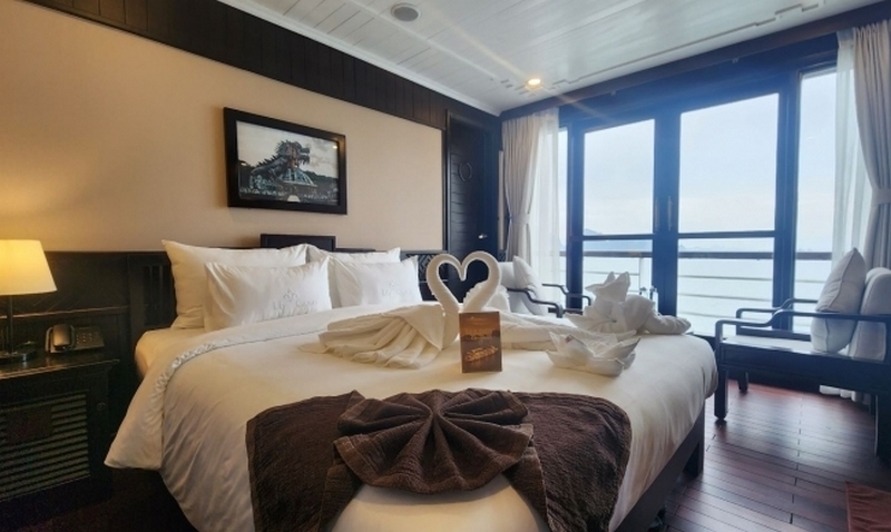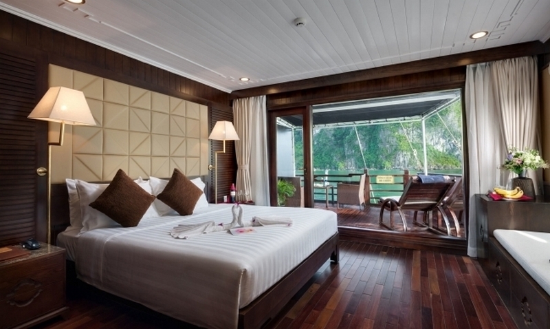 Luxurious and well-furnished cabins, all have a private balcony from which you can savor yourself in the beauty of Halong Bay